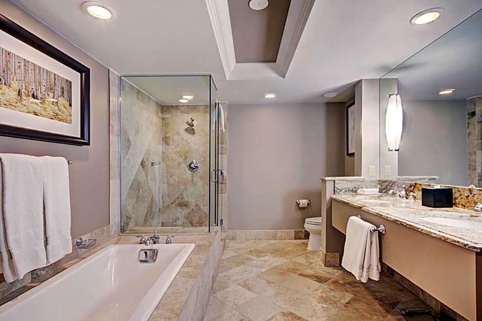 Featuring a Vail Mountain or courtyard view, this room features a marble floored private bathroom and a double vanity.